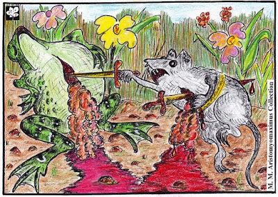 Das über zweitausend Jahre alte homerische Epillion, das im Original nur etwa 300 Verszeilen umfasst, wurde von R.W. A., der zehn Jahre lang daran gearbeitet hat, zu einem Mammutwerk aufgebläht, das die Batrachomyomachia mit der Ilias und der Bibel verbindet.